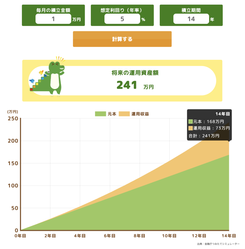 確かに、銀行預金として預けておくよりも利回りは良いかもしれません。しかし、先ほどのNISAの計算のように毎月1万円を年利5%で積み立てて、計算してみましょう。