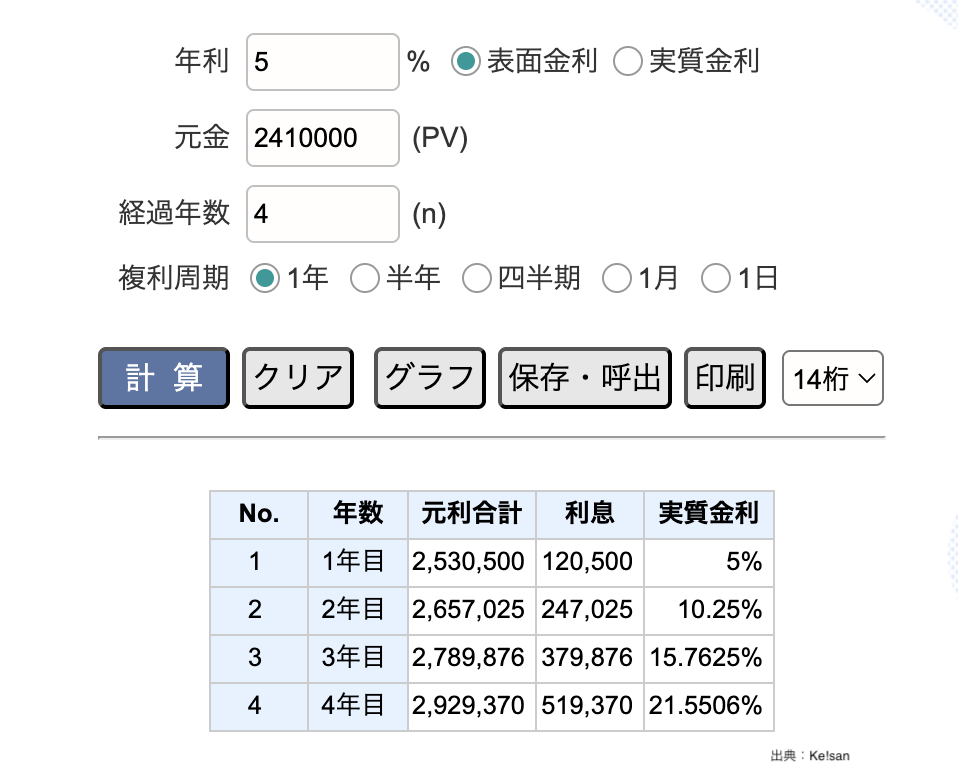 2年目:105万円スタート。5万2500円を受け取って110万2500円になる。