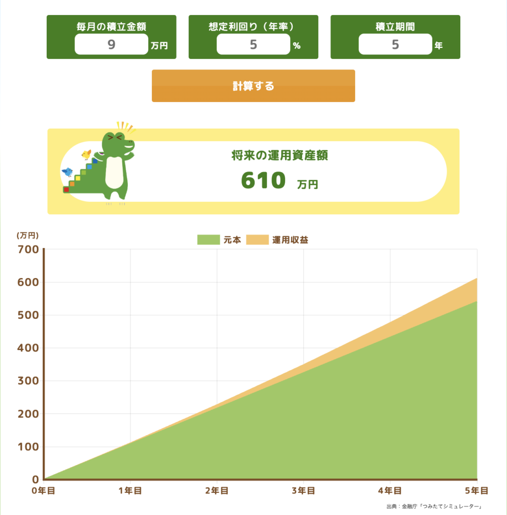 先ほどの、つみたてシミュレーションで違う計算をしてみましょう。毎月の積立金額3万円から9万円を増やして、期間を短くし15年から5年てみましょう。イメージとしては、子育てが終わった55歳。子どもが巣立ったので、子育てにかけていた分のお金に余裕ができたから、資産形成を始めようと思い、月々9万円を投資。期間は60歳までの5年間。