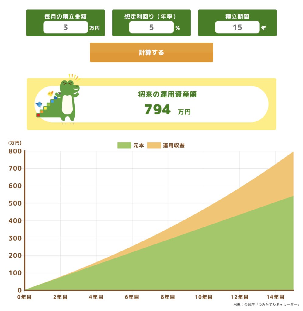 15年目の時点で元本(自分が払ったお金)が、540万円。残り254万円が、運用益です。
