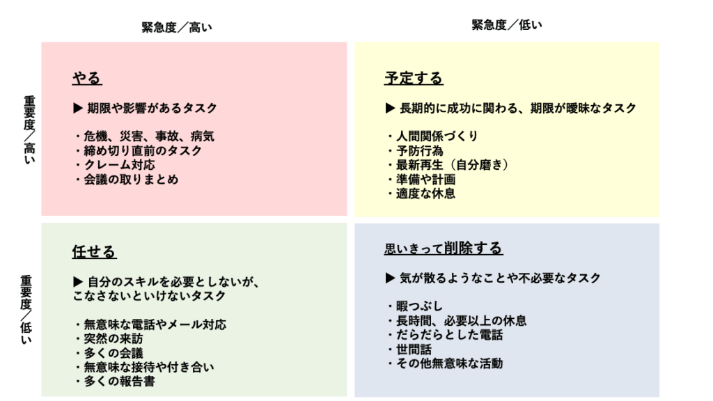 すべてのタスクを同じように扱うのは非効率です。ここでは、アメリカの元大統領アイゼンハワーが考案した「緊急度と重要度のマトリックス」を使います。タスクを以下の4つのエリアに分類し、優先順位をつけます。