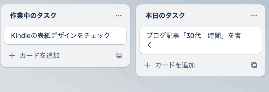 気軽にできるのは、紙とペンですが、私は「Trello」を使ってTodoを全て書き出しています。Trelloは以下のような画面で、タスクをカードにできて、移動も簡単にできるので、持っているタスクを把握しやすいです。